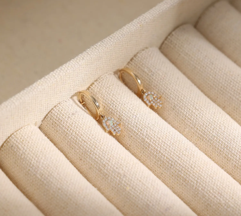 Introducing our Diamond & Opal Hamsa Hand Earrings—a perfect fusion of spirituality and sophistication. These earrings feature a delicately crafted Hamsa Hand adorned with sparkling diamonds and enchanting opals. The diamonds add a touch of sparkle to the protective symbol, while the opals bring an ethereal charm.