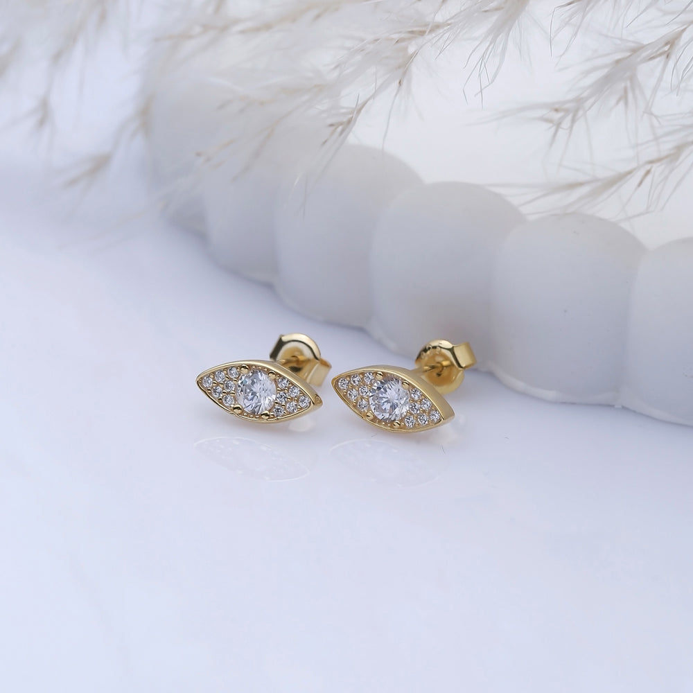 These Evil Eye Zircon Stud Earrings combine timeless protection symbolism with refined craftsmanship. Crafted from sterling silver and enhanced with a durable gold plating, each earring features a precisely set zircon stone that adds subtle brilliance. Designed for everyday wear, they offer both elegance and a meaningful touch, making them a sophisticated choice for those seeking style with cultural significance.